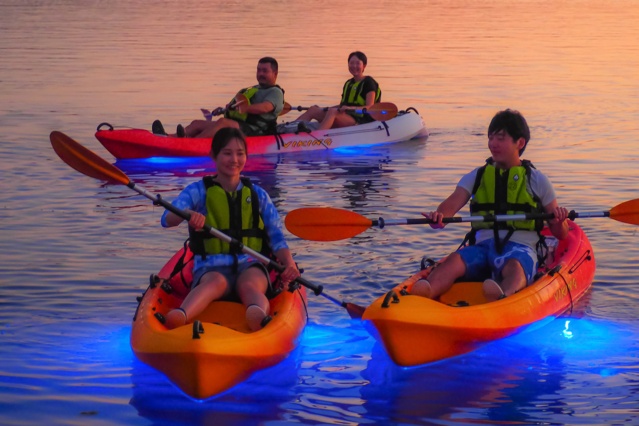 水中ライトが照らす海面と、カヤックのシルエットが織りなす光景は、まさに“映え”の瞬間。魚や海藻が写り込む幻想的な写真は、SNSでも話題になること間違いなし!