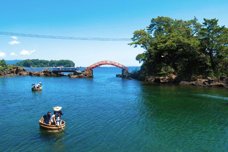 ■切り立つ岩と青い海のコントラストが美しい「尖閣湾揚島遊園」