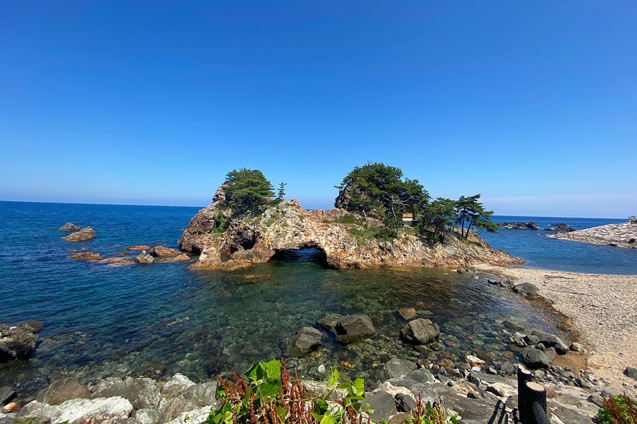 「赤亀岩」は「赤亀・風島なぎさ公園」の海水浴場から望む鉄石英の赤い大きな岩。中央部に空洞のある奇岩で、亀の親子が寄り添っているようにも見えます。「昔、水津の漁師が大時化に遭った際、大きな亀が現れ、船はその背に乗って港に戻った。亀は岩となり、村人たちは“赤亀”と名付けた」。そんな言い伝えが残る奇岩で、赤亀明神を祭る祠があります。